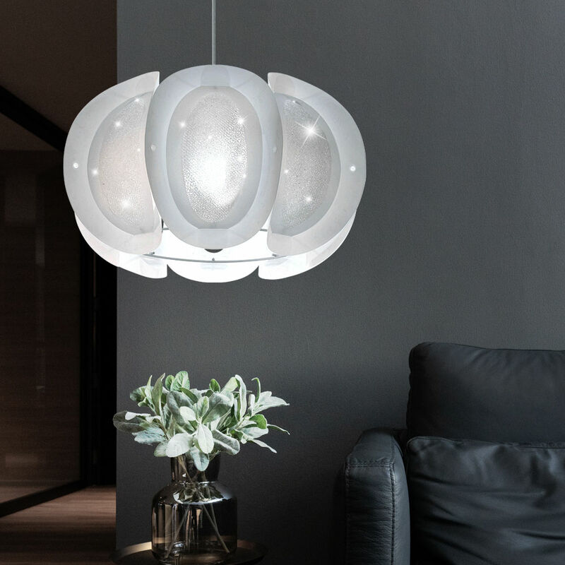 Descrizione Lampada a sospensione di alta qualità per il soggiorno. Questa bellissima lampada a sospensione attira davvero l'attenzione. La lamina bianca glitterata del paralume rende la lampada qualcosa di speciale e attira l'attenzione. Nella lampada è possibile utilizzare un potente illuminante fino a 60 watt e una base E27. La lampadina non è inclusa nella fornitura. Particolare lampada • Tipo di apparecchio: apparecchio a sospensione • Telaio: acciaio • Colore bianco • Paralume: lamina glitterata, bianca • Grado di protezione: IP20 • Dimensioni PxH in cm: 45x110 • Presa: 1x E27 • Lampadina inclusa: n • Potenza lampadina: max 1x 60 watt • Requisiti di alimentazione: da 220 a 240 volt, da 50 a 60 Hz