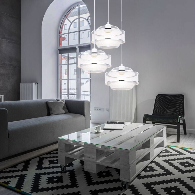 Descrizione Questa lampada a sospensione (Ø46.5cm, H: 150cm) colpisce per il suo aspetto moderno. La lampada è bianca e ha due anelli cromati silver, i tre shades sono costituiti da una rete metallica curva. Le prese E27 integrate sono progettate fino ad un massimo di 60W e consentono la sostituzione della lampada. La lampada non è inclusa nella dotazione di consegna. Dettagli lampada • tipo lampada: lampada a sospensione• Materiale: metallo• Paralume: gabbia, bianco, anelli cromati• Grado di protezione: IP20• diametro x altezza in cm: 46,5x150 • prese: 3x E27• lampadine incluse: no• potenza lampada: max 3x 60 watt• alimentazione: 220-240V, 50-60 Hz