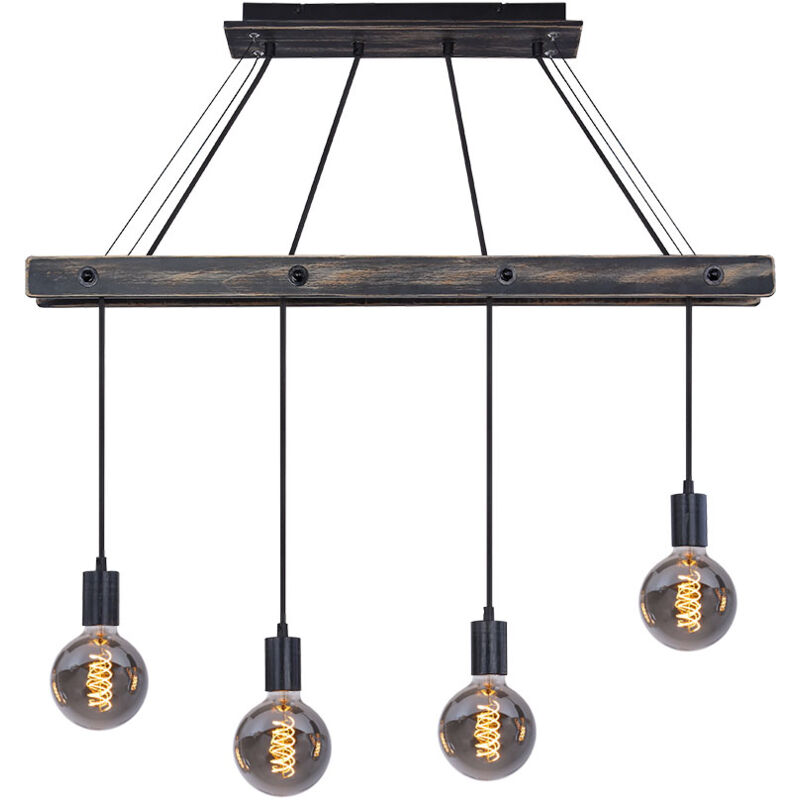 Descrizione La lampada a sospensione senza ombrello della serie Visso, realizzata in metallo e legno, viene azionata tramite un interruttore. Le quattro prese E27 ti consentono di scegliere tu stesso le lampadine fino a un massimo di 60 watt. Ciò consente di determinare da soli il colore della luce e la luminosità. La nostra raccomandazione sono le lampade a LED, poiché sono a risparmio energetico e di lunga durata. Puoi completare la tua zona giorno con le lampade da tavolo, terra e soffitto della serie. Le lampadine non sono incluse nella fornitura. Dettagli lampada • Tipo di lampada: lampada a sospensione • Materiale: metallo, legno • Colore: nero opaco, marrone • Lunghezza x larghezza x altezza in cm: 90 x 9 x 120 • Prese: 4x E27 • Lampadine incluse: no • Lampadine: 4x max 60 watt • Voltaggio: 230V, 50Hz