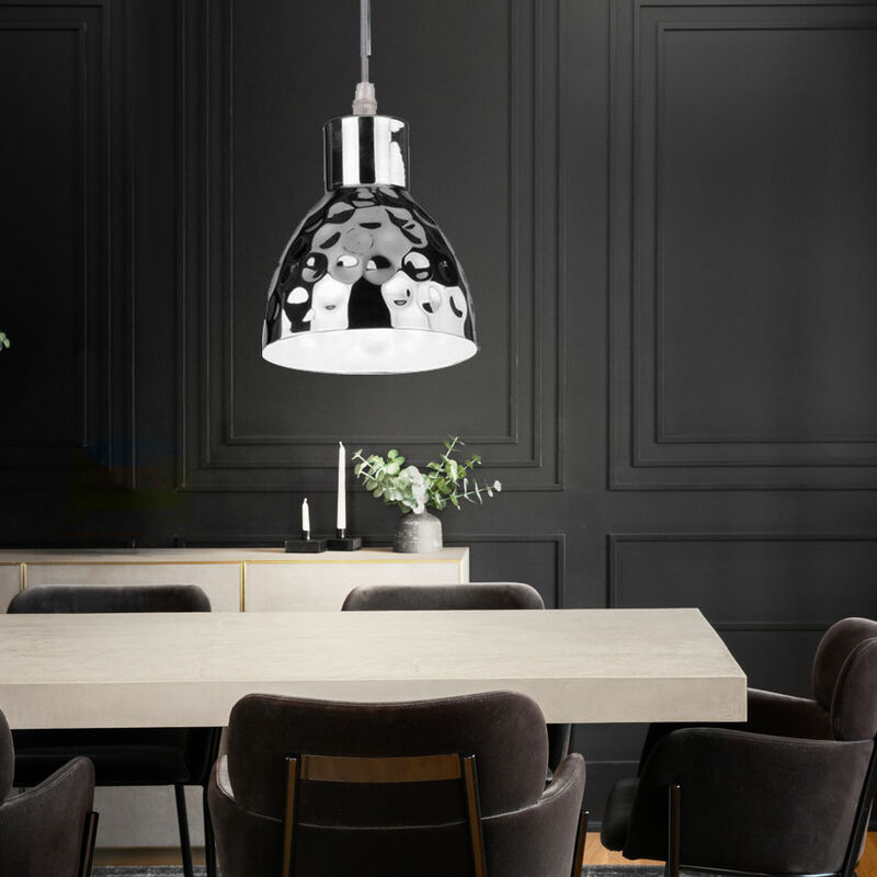 Descrizione Lampada a sospensione dall'aspetto martellato. Questa lampada a sospensione colpisce per il suo design straordinario. È realizzato in metallo cromato e attira l'attenzione sopra il tavolo del soggiorno o della sala da pranzo. Nella consegna è inclusa una sorgente luminosa a LED. Lampada dettagli • Tipo di lampada: lampada a sospensione • Materiale: metallo • Colore: cromo • Diametro paralume in cm: 15 • Altezza sospensione in cm: 100 • Attacco: 1x E27 • Lampadine incluse: sì • Potenza lampada: 7 watt • Flusso luminoso: 560 lumen • Colore della luce: bianco caldo • Alimentazione: 220-240V, 50-60Hz Dettagli lampadine • Tipo di lampadina: LED • Attacco: E27 • Design: palla • Materiale: alluminio • Colore bianco • Flusso luminoso: 560 lm (lumen) • Consumo energetico: 7 kWh/1000h • Temperatura colore: 3000K (Kelvin) • Colore della luce: bianco caldo • Resa cromatica (Ra): 80 • Consumo energetico nominale: 7 W (watt) • Durata utile nominale: 20.000 h (ore) • Cicli di