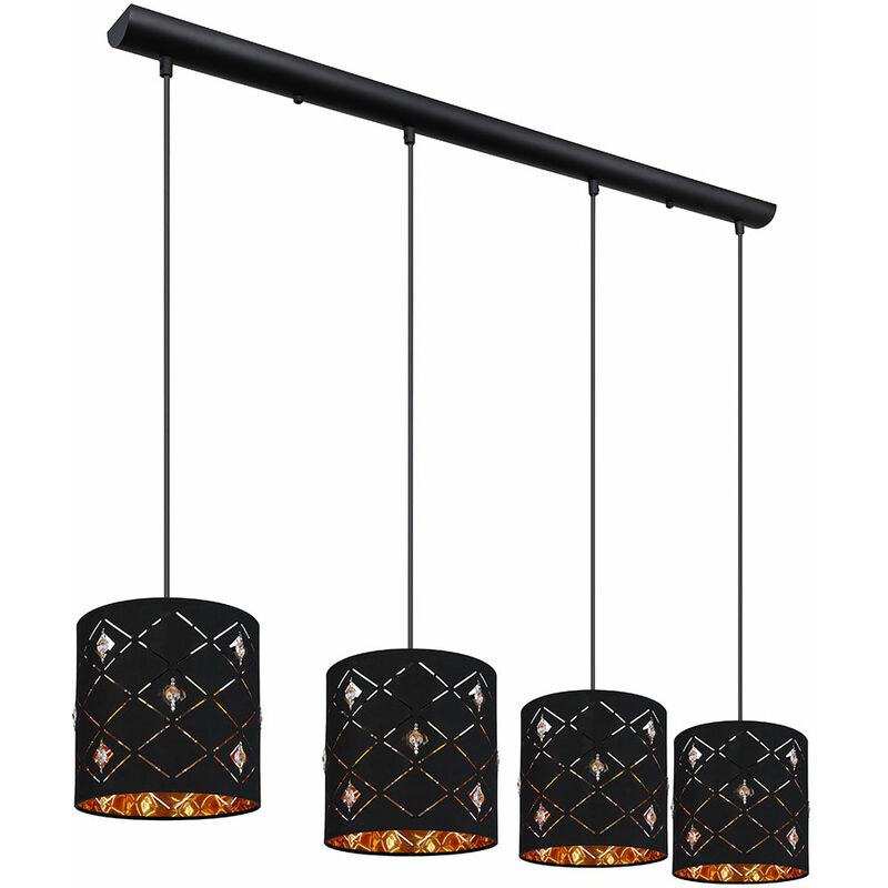 Descrizione Questa lampada a sospensione lunga 110 cm è un'aggiunta elegante ai tuoi interni con il suo design semplice fatto di metallo nero opaco e tessuti neri. Grazie alla sua forma allungata, la lampada a sospensione può essere posizionata meravigliosamente sopra un tavolo da pranzo, che viene quindi illuminato in modo uniforme. È possibile regolare l'altezza individualmente fino a 120 cm durante il montaggio. Inoltre, le quattro tonalità di tessuto nero con motivi a linee simmetriche e bellissimi cristalli acrilici possono essere equipaggiate con lampade E27 a tua scelta, dandoti la possibilità di determinare il colore della luce e la luminosità in base alle tue idee. Puoi completare il quadro generale nelle tue quattro pareti con altri modelli della stessa serie. Le lampadine non sono incluse nella fornitura. Dettagli lampada • Tipo di lampada: lampada a sospensione • Materiale: metallo, tessuto, cristalli acrilici • Colore: nero, trasparente • Lunghezza x larghezza x altezza