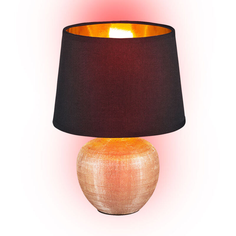 Descrizione Lampada moderna da tavolo in ceramica e tessuto. Questa lampada è disponibile in oro e nero, il che la rende una vera eye-catcher. Questa luce si adatta perfettamente allo studio, al soggiorno o alla camera da letto. La luce può essere comodamente accesa utilizzando l'interruttore a cavo sulla lampada da 150 cm cavo lungo acceso e spento. Utilizzando il telecomando in dotazione, l'illuminante LED RGB può essere impostato su diversi colori e garantisce così un'illuminazione d'atmosfera . Dettagli lampada • Tipo di lampada: lampada da tavolo• Materiale: ceramica• Colore: color oro• Paralume: tessuto, nero• interruttore a cordone• Grado di protezione: IP20• Lunghezza cavo in cm: 150 cm• Diametro x altezza in cm: 18 x 26• Peso: 0,63 kg • Presa: 1x E14• Lampadine incluse: sì• Potenza lampadina: 1x 3,5 watt• Flusso luminoso: 1x 320 lumen • Colore della luce: bianco caldo• Telecomando: solo per l'illuminante LED RGB• Alimentazione: 220-240 V, 50 -60Hz Dettagli sorgente luminosa