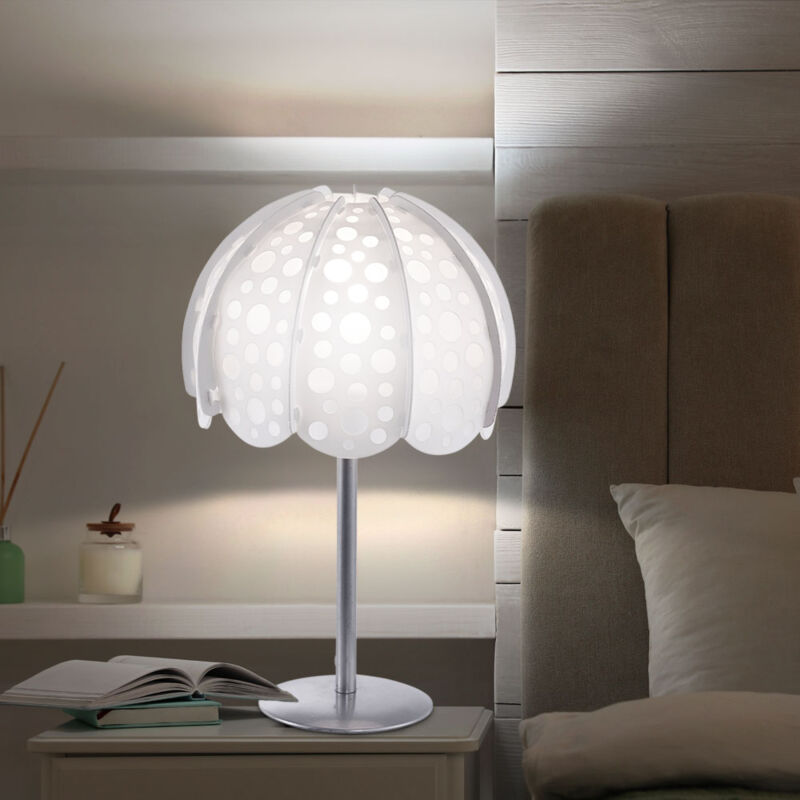 Descrizione Questa lampada da tavolo in tessuto e metallo è una vera attrazione ed è ideale per qualsiasi ambiente area. Questa lampada può essere utilizzata in vari modi grazie alle perforazioni decorative nel paralume. Grazie all'interruttore del cavo, puoi accendere e spegnere facilmente la lampada da tavolo. Dettagli lampada • Tipo di lampada: Lampada da tavolo • Materiale: Metallo • Paralume: Tessuto, bianco, fori • Interruttore a cavo• Classe di protezione: IP20 • Diametro x altezza in cm: 20,5x36 • Attacco: 1x E14 • Lampadina inclusa: Sì • Potenza lampadina: 1x 3 watt• Flusso luminoso: 1x 250 lumen• Colore luce: bianco caldo • Alimentazione: 220-240V, 50 -60 Hz Dettagli sorgente luminosa • Tipologia sorgente luminosa: LED • Attacco: E14 • Materiale: alluminio, plastica opale • Flusso luminoso: 250 lm (lumen) • Consumo energetico: 3,0 kWh/1000h • Temperatura colore: 3000 K (Kelvin) • Colore luce: bianco caldo • Consumo energetico nominale: 3 W (Watt) • Durata nominale: 25.000 h