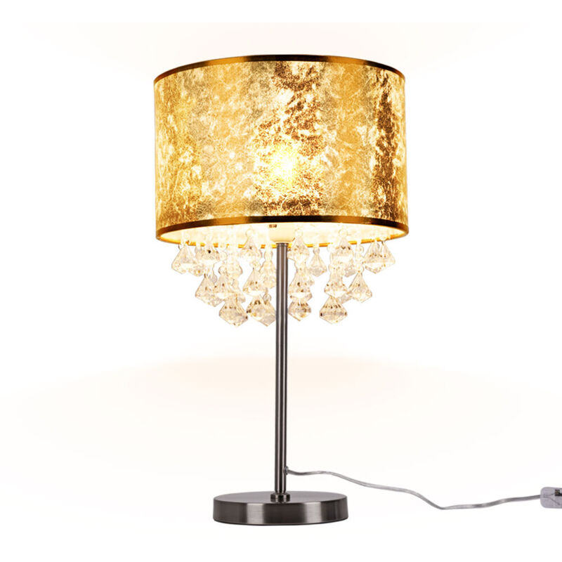 Descrizione Elegante lampada da tavolo per il soggiorno. Il paralume in tessuto con design in foglia d'oro ha una finitura metallica e ottiene ulteriore lucentezza a causa delle diverse trasparenze. La fitta cortina di cristalli acrilici rompe la luce e crea piccoli arcobaleni tutt'intorno. Dettagli Lampada • Tipologia lampada: lampada da tavolo • Montatura: metallo • Colore: nickel opaco • Paralume: tessuto • Colore: foglia d'oro • Sospensione: cristalli acrilici trasparenti • Cavo di alimentazione con interruttore: 1,5 m • Diametro x altezza in cm: 32 x 56 • Presa: 1x E27 • Lampadine incluse: Sì • Potenza lampadina: 10 watt • Flusso luminoso: 806 lumen • Colore luce: bianco caldo • Alimentazione: da 220 a 240 volt, da 50 a 60 Hz Dettagli lampadina • Tipo di sorgente luminosa: LED • Attacco: E27 • Design: Sfera (bianco-opale) • Materiale: Plastica • Flusso luminoso: 806 lm (lumen) • Consumo energetico: 10 kWh/1000h • Temperatura colore: 2700 K (Kelvin) • Colore della luce: bianco