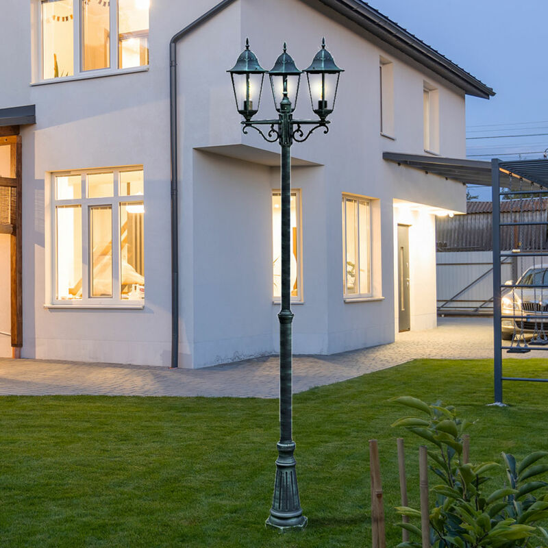 Descrizione Lampada da terra di alta qualità per uso esterno. Con un design accattivante, questa lampada adorna il tuo spazio esterno. Questa lampada è perfetta in cortile, vialetto o giardino. Ad esempio, puoi anche creare un bellissimo percorso con molte di queste luci. Tre potenti lampadine, ciascuna con un massimo di 100 watt e un attacco E27, possono essere utilizzate in questa luce per creare la scena per l'area prescelta. Grazie alla classe di protezione IP44, questa lampada è protetta dagli spruzzi d'acqua ed è quindi predestinata per l'uso esterno. La lampadina non è inclusa nella fornitura. Particolare lampada • Tipo di apparecchio: Candelabro • Materiale: alluminio pressofuso • Colore: Verde-Nero • Paralume: vetro, trasparente • Grado di protezione: IP44 • Lunghezza x larghezza x altezza in cm: 58 x 55 x 220 • Peso: 8 kg • Prese: 3x E27 • Lampadina inclusa: No • Potenza della lampada: 3x massimo 100 watt • Requisiti di alimentazione: da 220 a 240 volt, da 50 a 60 Hz
