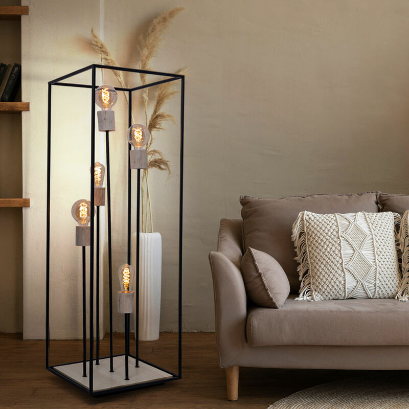 Descrizione Questa lampada da terra che si caratterizza per il suo design unico. La luce può risplendere attraverso la struttura in metallo nero (H:120 cm) su tutti i lati. Libera scelta dell'illuminante! La lampada ha 5 prese standard E27. In questi possono essere utilizzate lampade con una potenza massima di 60 watt. Per una sostenibilità ancora maggiore, consigliamo di utilizzare una sorgente luminosa a LED. La lampada soddisferà sicuramente ogni proprietario con il suo fascino unico. Per completare il quadro generale della tua casa, ti consigliamo di utilizzare altri modelli di questa serie. Le lampadine non sono incluse nella fornitura. Particolare lampada • Tipo di lampada: lampada da terra • Materiale: metallo, legno • Colore: nero, marrone • Cremagliera, telaio • Interruttore a pedale • Lunghezza x larghezza x altezza in cm: 40x40x120 • Prese: 5x E27 • Lampadina inclusa: n • Potenza lampada: massimo 5x 60 watt • Alimentazione: 230V, 50Hz