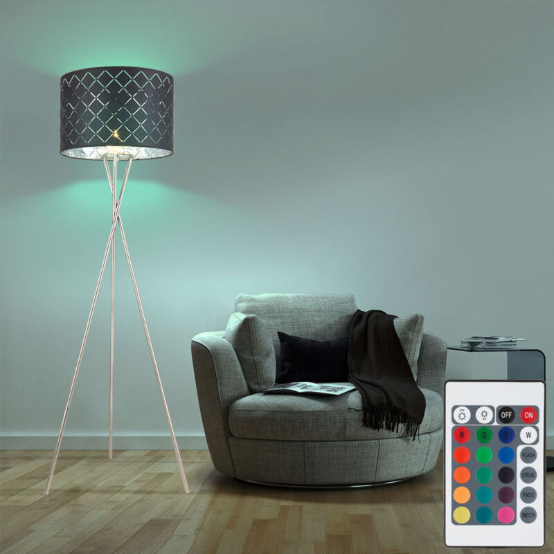 Descrizione Lussuosa lampada da terra con un elegante paralume in tessuto grigio e argento metallizzato. Questo apparecchio può essere utilizzato in svariati modi grazie alle punzonature decorative e al colore argento all'interno del paralume. È possibile accendere la luce utilizzando l'interruttore sul cavo. Utilizzando il telecomando in dotazione, la sorgente luminosa LED RGB può essere impostati in diversi colori e garantiscono così un'illuminazione d'atmosfera. Rispetto alle luci normali, i faretti a LED consumano una minima quantità di elettricità e hanno un consumo persino inferiore rispetto alle luci a risparmio energetico. Questo protegge l'ambiente e il tuo portafoglio. Sono inclusi una sorgente luminosa LED RGB di alta qualità a risparmio energetico e un telecomando per la luce bianca e il controllo RGB. Dettagli lampada • tipo di lampada: lampada da terra • materiale: nichel opaco • paralume: tessile, grigio/argento metallizzato • interruttore • diametro x altezza totale in