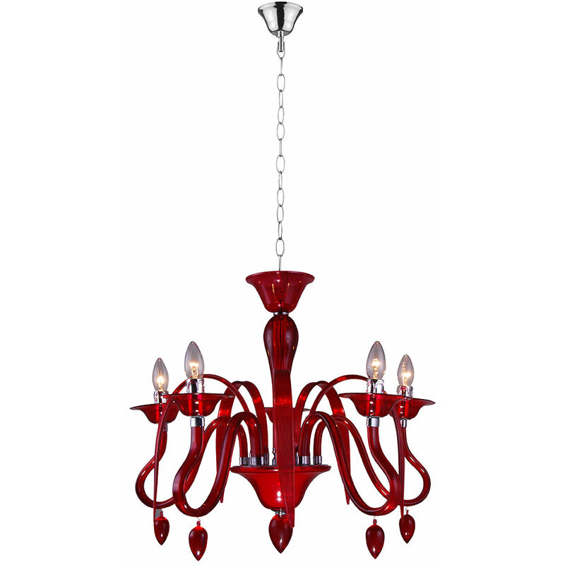 Descrizione Un magnifico e sontuoso lampadario in metallo cromato e plastica rossa. Il suo aspetto lo incanta immediatamente. Il lampadario ha un diametro di 55 cm. I cinque attacchi E14 ti consentono di decidere tu stesso quale lampadina (max. 40W) desideri utilizzare e quindi anche l'intensità della luce e il colore della luce. Le lampadine non sono incluse nella fornitura. Particolare lampada • Tipo di lampada: lampadario • Materiale: acrilico, metallo, plastica • Colore rosso • 5 luci • Grado di protezione: IP20 • Classe di protezione: 1 • Diametro x altezza in cm: 55x130 • Presa: 5x E14 • Lampadine incluse: no • illuminante adatto: 5x massimo 40W • Alimentazione: 230V, 50Hz