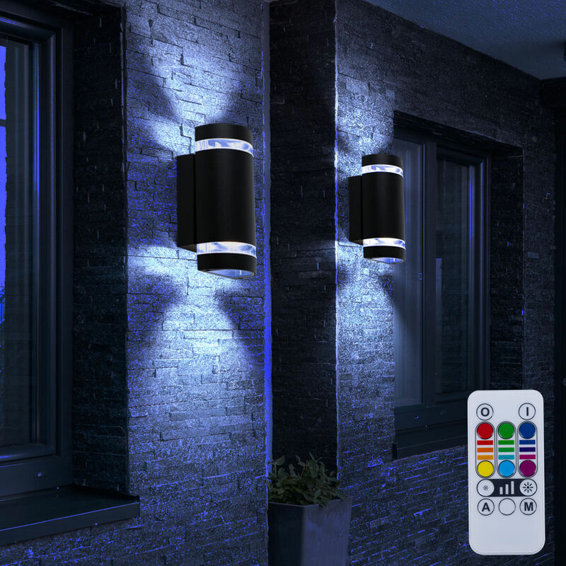 Descrizione Lampada da parete innovativa e di alta qualità per uso esterno Ottima fattura, aspetto elegante e finitura nobile - these sono le caratteristiche di questa lampada da parete di alta qualità. Grazie alla classe di protezione IP44, questa lampada è protetta contro gli spruzzi d'acqua e quindi predestinata per l'esterno Grazie a diversi colori, puoi decidere se vuoi aumentare l'atmosfera nel tuo giardino, ravvivare il tuo terrazzo o dare un tocco di aiuto di stile. Con il telecomando incluso nella fornitura, puoi accendere e spegnere facilmente e comodamente la tua luce di design e regolarla. Quindi risparmi l'ambiente e il tuo portafoglio. Due lampade LED RGB di alta qualità a risparmio energetico con telecomando per luce bianca e controllo RGB sono incluse nella fornitura. La fornitura include 2 applique! Dettagli lampada • Tipo di apparecchio: Lampada da parete • Cornice: alluminio pressofuso • Vetro di protezione: Vetro di protezione antiurto • Colore: nero • Grado di