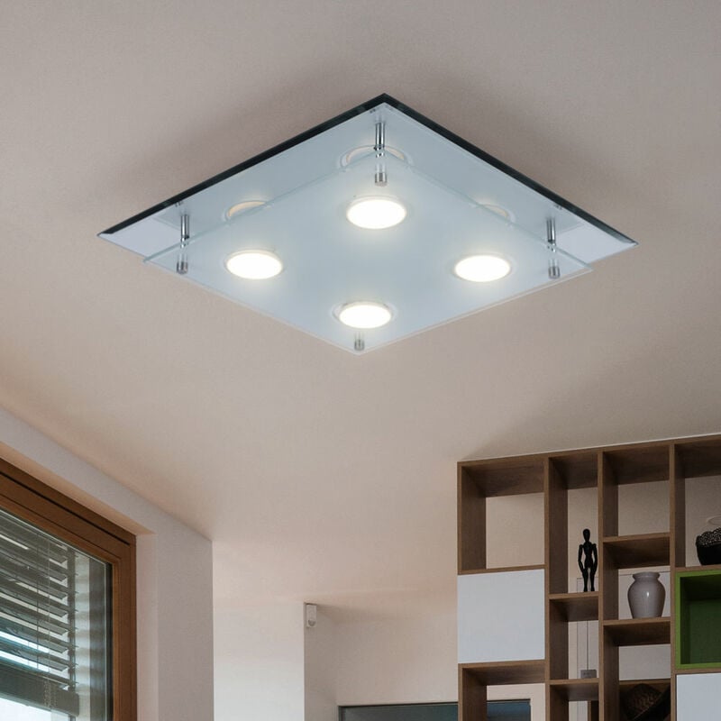 Descrizione La plafoniera a LED in un moderno look cromato non solo ti dà luce, ma anche un certo calore. Con il mix di materiali di vetro e la migliore cromatura e il conseguente design elegante, questa plafoniera attira l'attenzione sotto ogni aspetto! La plafoniera si adatta a quasi tutte le stanze, che si tratti di un soggiorno, di una camera da letto o persino di una cucina. Con una temperatura di colore di 3000 Kelvin, viene generata una luce bianca calda, così ora ti senti ancora più a tuo agio tra le tue quattro mura! Le lampadine sono incluse nella fornitura. Particolare lampada • Tipo di lampada: plafoniera • Materiale: cromo, vetro • Colore: cromo trasparente • 4 fiamme • Altezza x lunghezza x larghezza in cm:8x34x34 • Sorgente luminosa: 4x LED • Potenza della lampada: 4x 3 watt • Flusso luminoso: 4x 180 lumen • Colore della luce: bianco caldo • Alimentazione: 230V, 50Hz Dettagli lampadine • Tipo: SMD LED lampadine • Consumo energetico: 3 kWh/1000h • Attacco: GU10 • Consumo