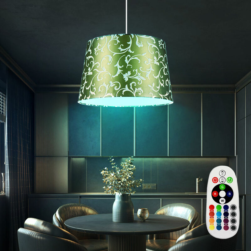 Descrizione Lampada a sospensione in tessuto con motivo floreale Grazie al suo design speciale, questa lampada è un vero occhio -catcher e attira l'attenzione di tutti tirati. Quando la luce è spenta, il tessuto del paralume è grigio, ma quando la luce è accesa sembra oro. Fa una bella figura sopra il tavolo del soggiorno o della sala da pranzo. Utilizzando il telecomando in dotazione, la lampada LED RGB può essere impostata in diversi colori e quindi fornisce un'illuminazione d'atmosfera Rispetto alle luci normali, i faretti a LED consumano una una quantità minima di elettricità e un consumo ancora più basso rispetto alle lampade a risparmio energetico Questo protegge l'ambiente e il tuo portafoglio Una lampada LED RGB di alta qualità a risparmio energetico e un telecomando per la luce bianca e il controllo RGB sono inclusi nella fornitura. Dettagli lampada • tipo lampada: sospensione ? • Paralume: tessuto grigio, fiori -Design ? • Diametro x altezza in cm: 40x135 • sospensione