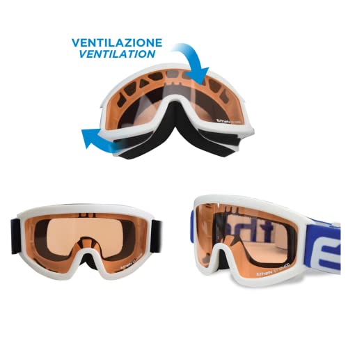 ETHEN Occhiali Maschera da Sci/Snow per Bambini, Maschera Entry Level a Lente Singola, Colorazione Arancio e Frame Bianco, Elastico Sostituibile, Made in Italy, Bianca con Fantasia Macchine