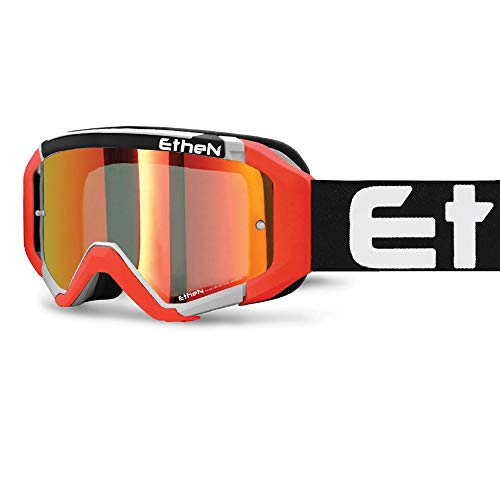 ETHEN Occhiali/Maschera Motocross e Enduro, Lente Cilindrica Specchiata Rossa, Clearfog (Antiappannante), in policarbonato con Filtri, Elastico Intercambiabile, Made in Italy, Nero/Rosso
