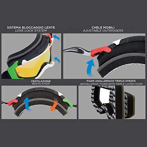CONTENUTO - A casa riceverai la nostra maschera da cross Nero/Rosso con lente specchiata rossa. Occhiali da motocross, enduro e fuoristrada. Una forma perfetta studiata per garantire grande comfort. Le chele snodate poste all'estremità della mascherina alloggiano l'elastico extra large che garantisce flessibilità, sicurezza e resistenza durante la guida. Ultraleggera e resistente, ti dimentichi di averla addosso mentre protegge gli occhi.