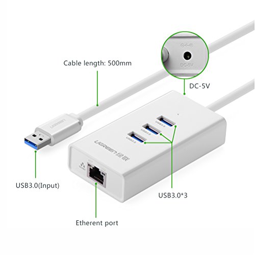 Hub USB 3.0 Ethernet Ugreen 3 Tre Porte con 1 RJ45 Porta 10/100/1000Mbps Gigabit Ethernet LAN Adattatore di Rete per Windows Surface Pro, IdeaPad, MacBook Air e MacBook Retina,Tablet, Bianco