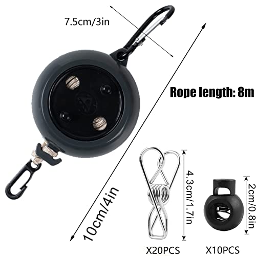 【COMPATTO E LEGGERO】- Questo stendibiancheria da campeggio mette uno stendino lungo 10m in una scatola rotonda con un diametro di 7,5 cm e uno spessore di 3,5 cm. Può essere tenuto con una mano, sia che venga messo in uno zaino o in una borsa, o direttamente nella tasca dei pantaloni, sono molto salvaspazio, facili da trasportare. Il design del gancio metallico può anche essere appeso alla borsa da viaggio, che è molto adatto per le attività all'aperto.