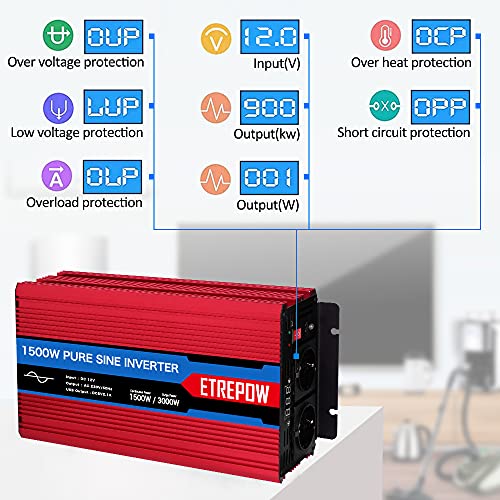 ETREPOW 1500w Power Inverter 12v 220v Onda Sinusoidale Pura Convertitore di Tensione Con 2 Prese EU e Una 2,1A USB, Telecomando Senza Fili,Display Digitale e 2 Ventilatori - picco 3000w Trasformatore