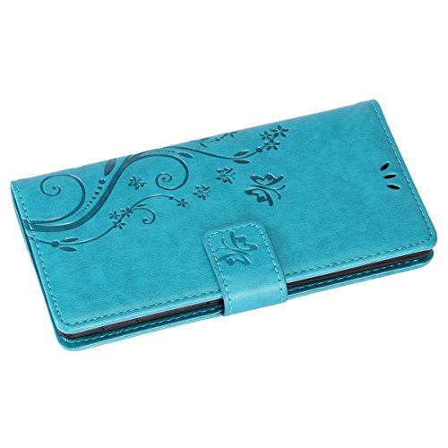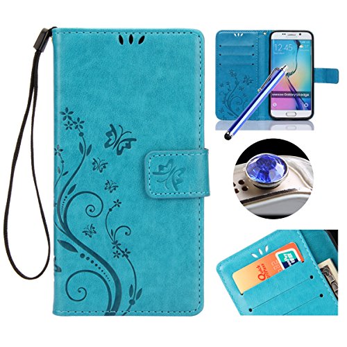 Etsue custodia in pelle con cinghia per Samsung Galaxy Core Prime G360, retro semplice rosa fiore farfalla stile libro Flip Case per Samsung Galaxy Core Prime G360 + blu Stylus pen e scintillio di Bling Diamond Dust Plug colora casuale, Ecopelle Pelle, Butterfly,Blue, Samsung Galaxy S7