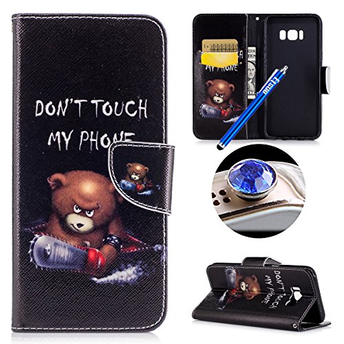 Etsue Portafoglio Custodia per Samsung Galaxy S8 Plus Orso Custodia in pelle Protettiva Flip Case Cover [Lanyard], goffratura Flip Custodia in pelle Custodia Case Borsa Custodia Vintage Custodia Cover Chiusura Magnetica e Supporto per Samsung Galaxy S8 Plus-Do not Touch My Phone Orso, Blu scuro + 1 X diamante spina della polvere + 1 X Blu penna per PDA