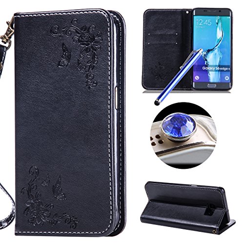 Etsue Samsung Galaxy S6 Edge Plus Cover Pelle,Samsung Galaxy S6 Edge Plus Custodia Nero,Semplice Disegni Con Chiusura Magnetica Puro PU Flip Libro Bookstyle Con Cinghia Shockproof Protettiva Custodia Corpeture Case per Samsung Galaxy S6 Edge Plus+Blu Pennino e scintillio di Bling Diamond Dust Plug colora Casuale-#Nero