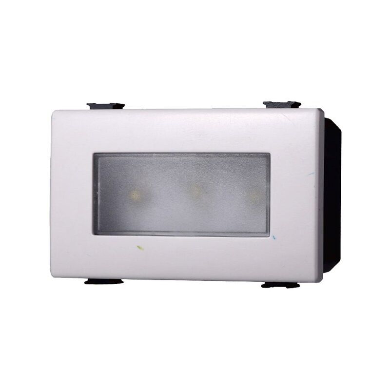 Lampada led segnapasso da incasso 3 moduli, compatibile con serie bticino Matix.La lampada ha una potenza di 2.4 Watt ed è disponibile in due differenti colorazioni luce: Bianco Caldo 3000°K e Bianco Freddo 6000°K. DESCRIZIONE Lampada led di emergenza e segnapasso da incasso 3 moduli, compatibile con serie bticino Matix. La lampada ha una potenza di 2.4 Watt ed è disponibile in due differenti colorazioni luce: Bianco Caldo 3000°K e Bianco Freddo 6000°K. SPECIFICHE TECNICHE Modello MT03-3 Numero moduli 3P Alimentazione AC 220V - 50/60Hz Potenza 2.4W Flusso Luminoso 24/26 lumen Autonomia 120 minuti Rischio Fotobiologico Esente Classe II Grado Impermeabilità IP20 Materiale ABS Colore Bianco Serie Compatibile Bticino Matix Compatibilità Scatola 503