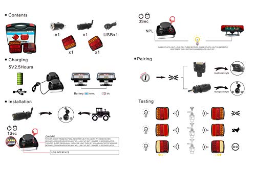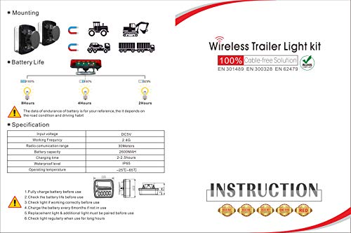 Multifunzionale: la batteria può essere completamente carica in 2,5 ore e questo ti darà 8 ore di ricarica. La comunicazione radio può raggiungere fino a 30 metri, è necessario sostituire regolarmente le luci del rimorchio tra i veicoli? Rendi questo compito più facile e veloce, con le nostre luci wireless per rimorchi.