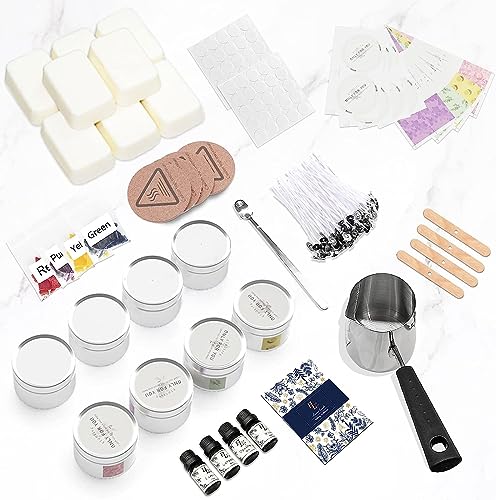 Kit completo per realizzare candele fai da te tutto in uno: include 480 g di cera di soia (8 cera di soia, 1 blocco di circa 60 g = 1 barattolo di candela), 1 vaso di fusione, 1 cucchiaio per mescolare, 8 barattoli di candela (6 x 6 x 4 cm circa), 2 fermagli a papillon, 4 oli profumati, 4 blocchi di colorazione, 4 isolanti. Tappeti, 16* Adesivi fai da te, 50 stoppini per candele e 50 adesivi per stoppini, 1 manuale utente (lingua italiana non garantita). Molto adatto per i principianti.