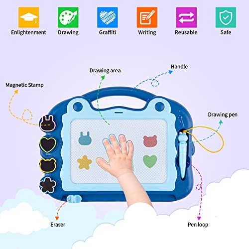 Blocco da disegno magnetico: questo lavagna magnetica per bambini viene fornito con 4 timbri per cartoni animati, 4 diversi colori per la scrittura a mano (blu, rosso, giallo, verde), 1 stilo, in modo che i bambini possano disegnare un mondo colorato.Ispira la creatività dei bambini.I genitori possono giocare con i loro bambini, rafforzare l'interazione genitore-figlio, migliorare la comunicazione, insegnare ai bambini a imparare i colori e migliorare la loro capacità di scrivere e dipingere.