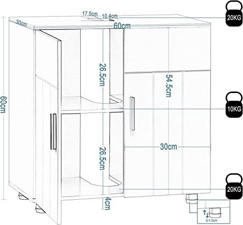 ✅【Ampio spazio】: il mobiletto sotto lavandino misura 60x30x60cm. Il ripiano e i 2 scomparti possono contenere meglio gli oggetti da bagno. Misura del sifone: 17,5x10,4cm, si prega di misurare in anticipo le misure del foro del sifone e del lavandino