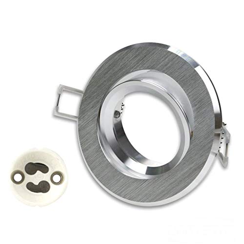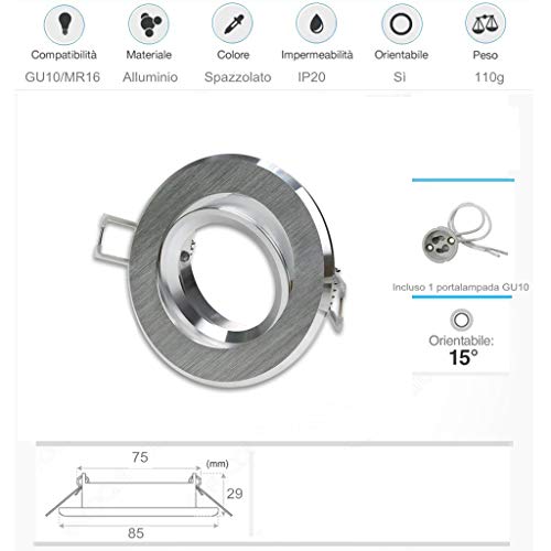 Eurekaled - Portafaretto da Incasso Tondo Orientabile Alluminio Spazzolato, per Faretto GU10 e MR16, Foro di Incasso 75mm, Diametro 85mm. cod. 244810