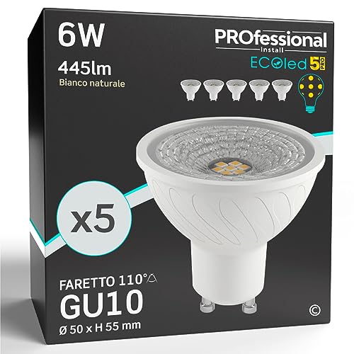 Eurocali Lampadine LED GU10 6W Professionali Trasparente 445 lumen - Forma: Faretto - Luce Bianco Naturale 4000K - Fascio Luminoso 110° - Pacco da 5