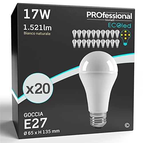 Eurocali 20 x Lampadine LED E27 17W Opaca 1521 lumen - Forma: Goccia A65 - Luce Bianco Naturale 4000K - Fascio Luminoso 200°