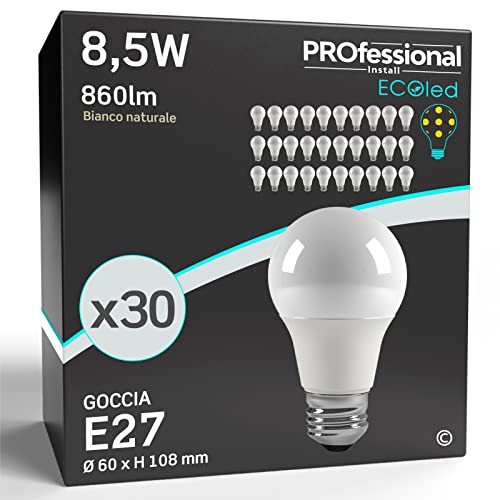 Eurocali 30x Lampadine LED E27 8,5W Opaca (806 lumen equivalenti a 60W) Forma Goccia A60 Luce Bianco Naturale 4000K - Fascio Luminoso 200