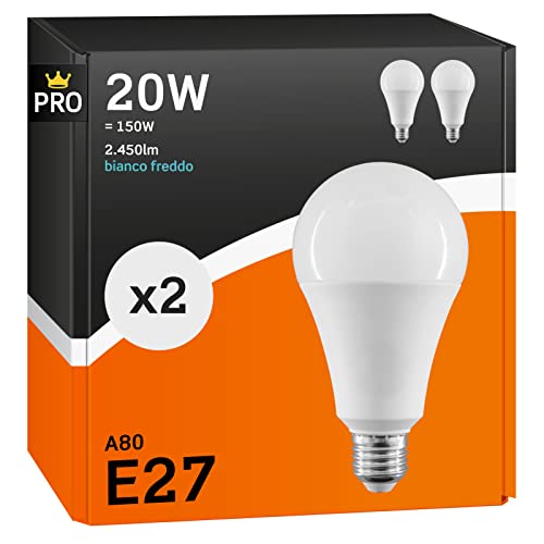 Eurocali 2 x Lampadine LED E27 20W Professionali Garanzia 5 anni (2450 lumen equivalenti a 150W) Forma: Goccia A80 Fascio Luminoso 200° (Bianco Freddo 6500K - Pacco da 2)