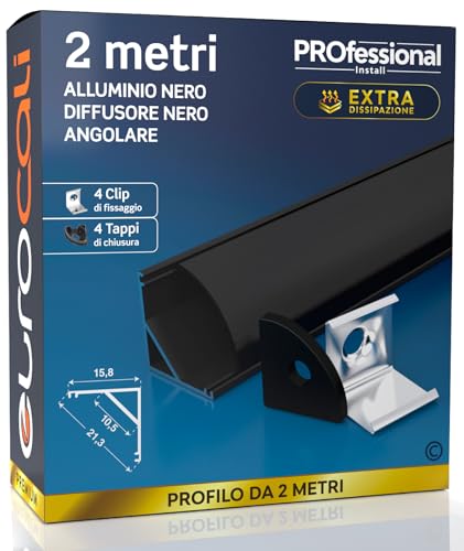 Eurocali Profilo Angolare da 2 metri (2mt) in Alluminio Nero per Strisce LED Schermo Nero per Strisce LED max 10.5mm - 15.8 x 15.8
