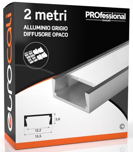Eurocali 1x Profilo da 2 metri (2mt) in Alluminio grigio per Strisce LED Copertura Opaca larghezza max striscia led 12.2mm - 15.5 x 5.9