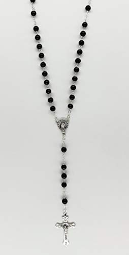 Eurofusioni Rosario cattolico Preghiera Uomo e Donna - Collana di Perline in Vetro Nero e Croce placcata Argento
