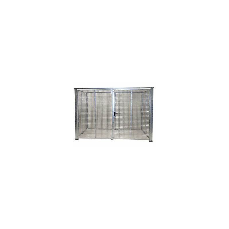 Container in griglia metallica per bombole di gas, senza tetto, con porta a doppio battente, largh. x prof. 3100 x 2100 mm. Fornitura = smontato. Luogo d'impiego = per esterni. Altezza esterna = 2070 mm. Larghezza esterna = 3100 mm. Profondità esterna = 2100 mm. Capacità bombole = 104 x Ø 220 mm. Materiale = acciaio. Superficie = zincatura a fuoco. Classi di pericolosità = per il magazzinaggio esterno di bombole di gas in conformità a TRGS 510. Versione = senza tetto. Versione pavimento = senza pavimento. Tipo di porta = porta a doppio battente. Serratura = chiusura a cilindro. Peso = 287 kg. Tipo di prodotto = container per bombole di gas. Per il magazzinaggio esterno di bombole di gas in conformità a TRGS 510. Robusta struttura con telaio in acciaio zincato a fuoco - Montaggio semplice. Pareti posteriori, pareti laterali e porte a battente con serratura in griglia per una ventilazione ottimale. Porte a battente con serratura a cilindro profilato. Vengono consegnati smontati