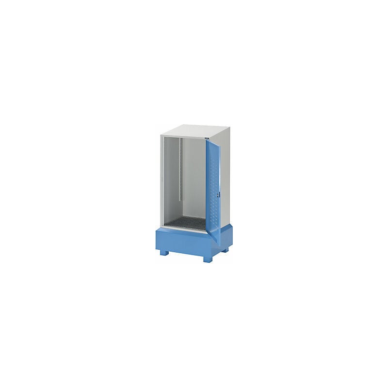 Depositi per fusti e taniche per sostanze pericolose, a 1 anta, con copertura a spiovente. Fornitura = montato. Altezza esterna = 2050 mm. Larghezza esterna = 940 mm. Profondità esterna = 740 mm. Capacità fusti = 1x200 l. Capacità di raccolta = 220 l. Colore = grigio chiaro RAL 7035, blu chiaro RAL 5012. Superficie = zincatura e verniciatura a polvere. Marchio di collaudo = dichiarazione di conformità (ÜHP) secondo le disposizioni costruttive di cui alla lista A, parte 1, DIBt, Berlino. Materiale = lamiera d'acciaio. Serratura = serratura a cilindro. Altezza interna = 1440 mm. Larghezza interna = 830 mm. Profondità interna = 650 mm. Versione = a 1 anta. Luogo d'impiego = per interni ed esterni. Per sostanze = liquidi infiammabili e inquinanti per le acque. Classi di pericolosità = per liquidi inquinanti per le acque delle categorie GHS 1 - 4, per il magazzinaggio passivo di sostanze infiammabili delle categorie GHS 1 - 3. Altezza posteriore = 2050 mm. Altezza anteriore = 1950 mm. Peso