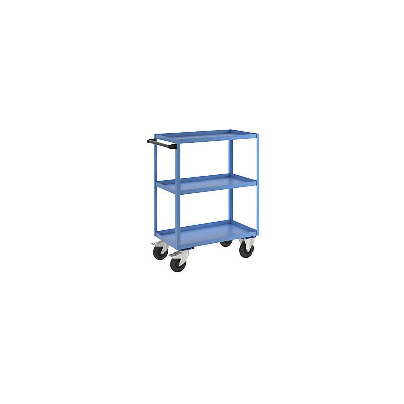Carrello per reparti di montaggio, 3 ripiani, portata 350 kg, altezza totale 1215 mm, blu chiaro. Fornitura = montato. Numero piani = 3 pz. Lunghezza superficie di carico = 900 mm. Larghezza superficie di carico = 500 mm. Colore = blu chiaro RAL 5012. Materiale superficie di carico = lamiera d'acciaio, verniciata a polvere. Portata = 350 kg. Altezza ripiani = 220 / 710 / 1175 mm. Altezza = 1215 mm. Tipo di prodotto = carrelli di montaggio con 3 vasche. Dotazione ruote = 2 rotelle pivottanti con fermo doppio, 2 rotelle a supporto fisso. Versione ruote = gomma piena. Diametro ruote = 160 mm. Cuscinetti ruota = cuscinetto a rulli. Ripiani a vasca con bordino di 40 mm per lavorare in sicurezza con olio e altri liquidi. Trasporto sicuro, poiché il bordino impedisce agli oggetti di cadere. Spazio versatile utile per il settore industriale, stabilimenti produttivi o autofficine. L'impugnatura e le rotelle pivottanti permettono di spostarsi in modo flessibile verso il luogo di utilizzo.