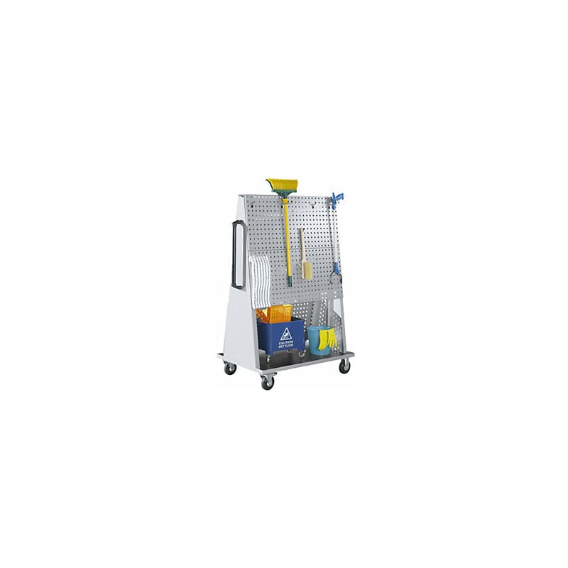 Postazione di pulizia, con rotelle, lungh. x largh. x alt. 1010 x 650 x 1564 mm. Fornitura = smontato. Volume di fornitura carrelli per pulizia = impugnatura. Materiale telaio = lamiera d'acciaio. Altezza = 1564 mm. Colore = alluminio brillante RAL 9006. Lunghezza = 1010 mm. Larghezza = 650 mm. Superficie = verniciatura a polvere. Dotazione ruote = 4 rotelle pivottanti, di cui 2 con fermo doppio. Diametro ruote = 125 mm. Cuscinetti ruota = cuscinetto a rulli. Versione = con 5 pannelli forati. Tipo di prodotto = carrelli per pulizie. Per alloggiare o trasportare diversi attrezzi per la pulizia. Pannelli forati su entrambi i lati accessoriabili individualmente. Robusto telaio in lamiera d'acciaio, con cinque pannelli forati. Verniciatura a polvere di qualità in alluminio brillante RAL 9006. Ganci non compresi nella fornitura. Versione mobile con 4 rotelle pivottanti di cui 2 con fermo doppio. Ø 125 mm, ruote in gomma piena con cuscinetti a rulli. Comoda impugnatura sul lato corto.