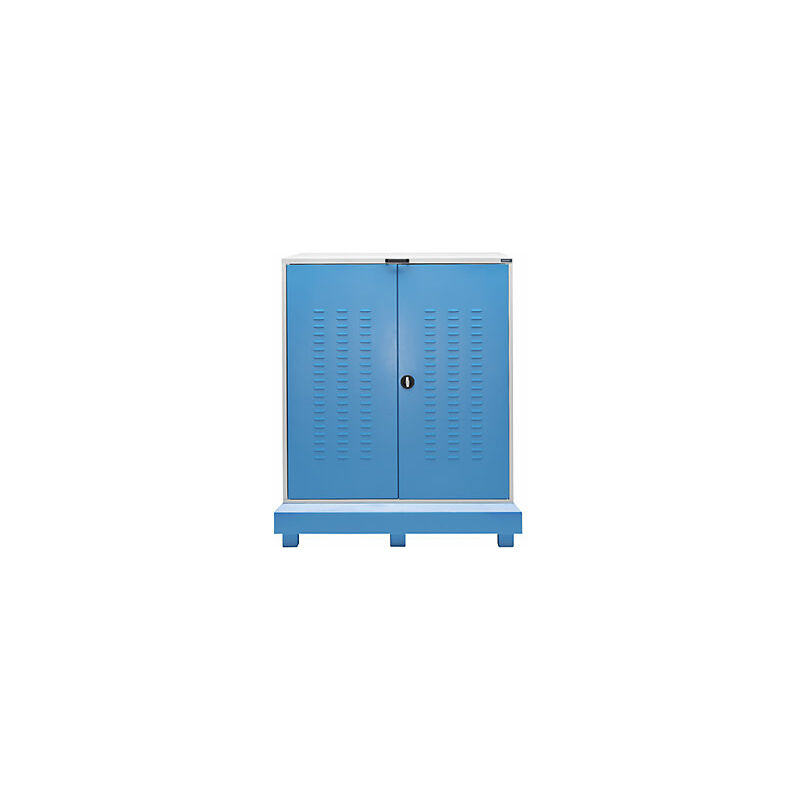 Deposito per fusti per sostanze pericolose, capacità di raccolta 400 l, largh. x prof. 1600 x 1450 mm. Fornitura = montato. Altezza esterna = 1895 mm. Larghezza esterna = 1600 mm. Profondità esterna = 1450 mm. Capacità fusti = 4x200 l, 9x60 l. Capacità di raccolta = 400 l. Colore = grigio chiaro RAL 7035, blu chiaro RAL 5012. Superficie = zincatura e verniciatura a polvere. Marchio di collaudo = dichiarazione di conformità (ÜHP) secondo le disposizioni costruttive di cui alla lista A, parte 1, DIBt, Berlino. Materiale = lamiera d'acciaio. Luogo d'impiego = per interni ed esterni. Per sostanze = liquidi infiammabili e inquinanti per le acque. Classi di pericolosità = per liquidi inquinanti per le acque delle categorie GHS 1 - 4, per il magazzinaggio passivo di sostanze infiammabili delle categorie GHS 1 - 3. Altezza posteriore = 1895 mm. Altezza anteriore = 1875 mm. Peso = 210 kg. Il tettuccio è sollevabile e facile da aprire e chiudere grazie a due ammortizzatori a gas. Due ante ad
