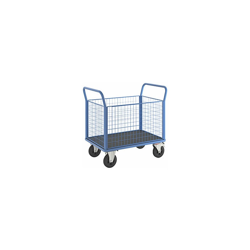 Carrello a pianale, con 4 sponde grigliate, lungh. x largh. 1050 x 700 mm, ruote in gomma piena. Fornitura = in parte smontato. Portata = 500 kg. Dotazione = 4 sponde alte. Lunghezza superficie di carico = 1050 mm. Larghezza superficie di carico = 700 mm. Altezza di carico = 280 mm. Lunghezza = 1050 mm. Larghezza = 700 mm. Altezza = 1100 mm. Altezza impugnatura = 1100 mm. Colore telaio = blu chiaro RAL 5012. Versione ruote = ruote in gomma piena. Diametro ruote = 200 mm. Cuscinetti ruota = cuscinetto a rulli. Dotazione ruote = 2 rotelle pivottanti con fermo doppio, 2 rotelle a supporto fisso. Peso = 59.62 kg. Materiale superficie di carico = plastica. Materiale impugnatura = acciaio, verniciato a polvere. Versione impugnatura = fissa. Materiale telaio = acciaio, verniciato a polvere. Le sponde alte su tutti i lati proteggono il carico. Pratici e versatili grazie alle sponde in griglia estraibili singolarmente. L'altezza ergonomica dell'impugnatura e le rotelle pivottanti permettono di