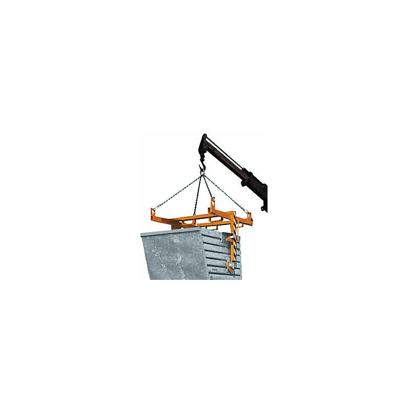 Traversa per elevatori per cassoni ribaltabili e contenitori impilabili, sollevabile a mezzo gru, portata 500 kg, per dimensioni contenitori 0,3 m³. Fornitura = montato. Superficie = verniciatura. Colore = grigio topo RAL 7005. Altezza = 845 mm. Lunghezza = 945 mm. Larghezza = 730 mm. Portata = 500 kg. Peso = 93 kg. Interasse = 310 mm. Dimensioni interne entrate forche largh. x alt. = 200x80 mm. Materiale = profilato d'acciaio. Per capacità = 0.3 m³. Tipo di prodotto = traverse. Attivazione mediante paranco a fune azionabile dall'elevatore. Catena di sicurezza. Dimensione A nella tabella: dal bordo superiore delle forche fino al bordo inferiore del cassone rovesciato.
