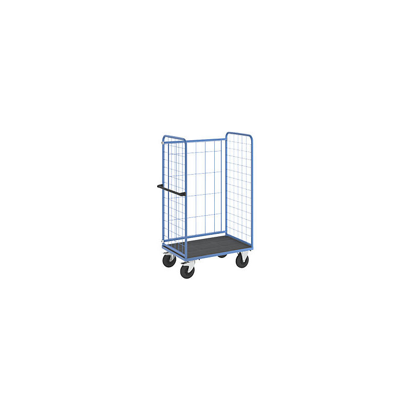 Carrello a ripiani, sponde grigliate su tre lati, portata 500 kg, ruote in gomma piena, superficie di carico lungh. x largh. 940 x 630 mm. Fornitura = smontato. Versione carrelli a ripiani = lati corti e 1 lato lungo grigliati. Portata = 500 kg. Lunghezza superficie di carico = 940 mm. Larghezza superficie di carico = 630 mm. Lunghezza = 1150 mm. Larghezza = 700 mm. Altezza = 1792 mm. Numero piani = 1 pz. Portata per ripiano = 50 kg. Ripiano di base = plastica. Dotazione ruote = 2 rotelle pivottanti con fermo doppio, 2 rotelle a supporto fisso. Diametro ruote = 200 mm. Versione ruote = gomma piena. Passo reg. altezza ripiani intermedi = 100 mm. Dimensioni maglie griglia anteriore = 100x100 mm. Dimensioni maglie griglia posteriore = 150x300 mm. Colore telaio = blu chiaro RAL 5012. Materiale telaio = tubo d'acciaio, verniciato a polvere. Trasporto sicuro delle merci e praticità di carico grazie alle sponde in griglia su 3 lati. I freni di stazionamento mantengono il carrello saldamente