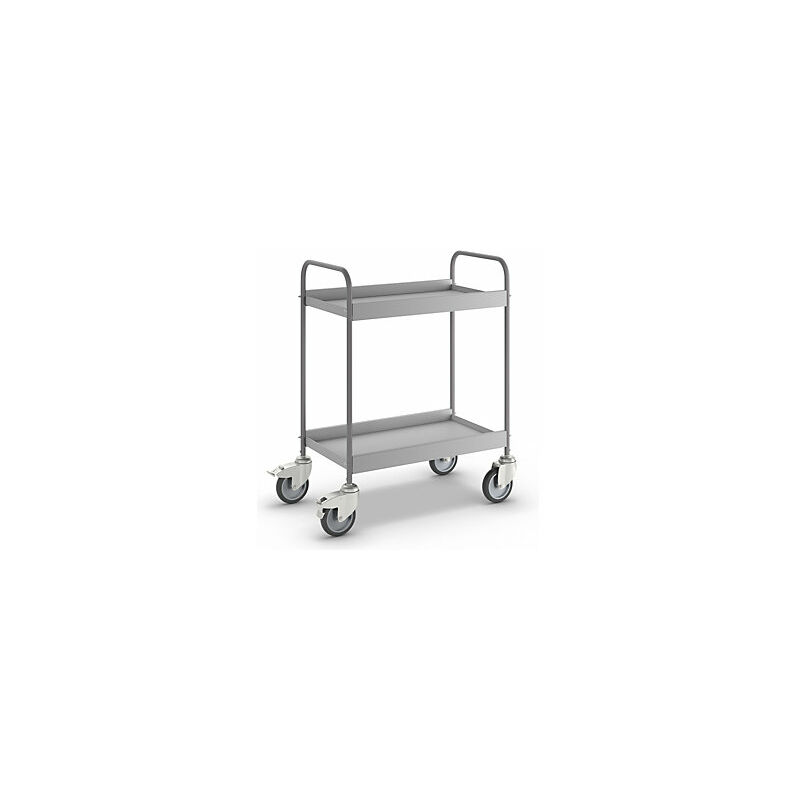 Carrello portamateriale, con 4 rotelle pivottanti, 2 con fermo doppio, Ø ruota 125 mm. Fornitura = smontato. Altezza = 850 mm. Lunghezza superficie di carico = 620 mm. Larghezza superficie di carico = 390 mm. Lunghezza = 670 mm. Altezza ripiani = 230 / 780 mm. Portata = 40 kg. Numero piani = 2 pz. Larghezza = 420 mm. Portata per piano = 20 kg. Materiale telaio = tubo d'acciaio, verniciato a polvere. Colore telaio = grigio argento RAL 7001. Materiale = truciolato con verniciatura plastica. Colore superficie di carico = grigio. Numero maniglioni = 2 pz. Dotazione ruote = con 4 rotelle pivottanti, 2 con fermo doppio. Versione ruote = gomma piena antitraccia. Diametro ruote = 125 mm. Peso = 11.2 kg. I freni di stazionamento mantengono il carrello saldamente in posizione. Ideali per il catering. Le impugnature su entrambi i lati e le rotelle pivottanti consentono di spostarsi in modo flessibile verso il luogo di utilizzo. Le ruote antitraccia non rovinano il pavimento e non lasciano segni.