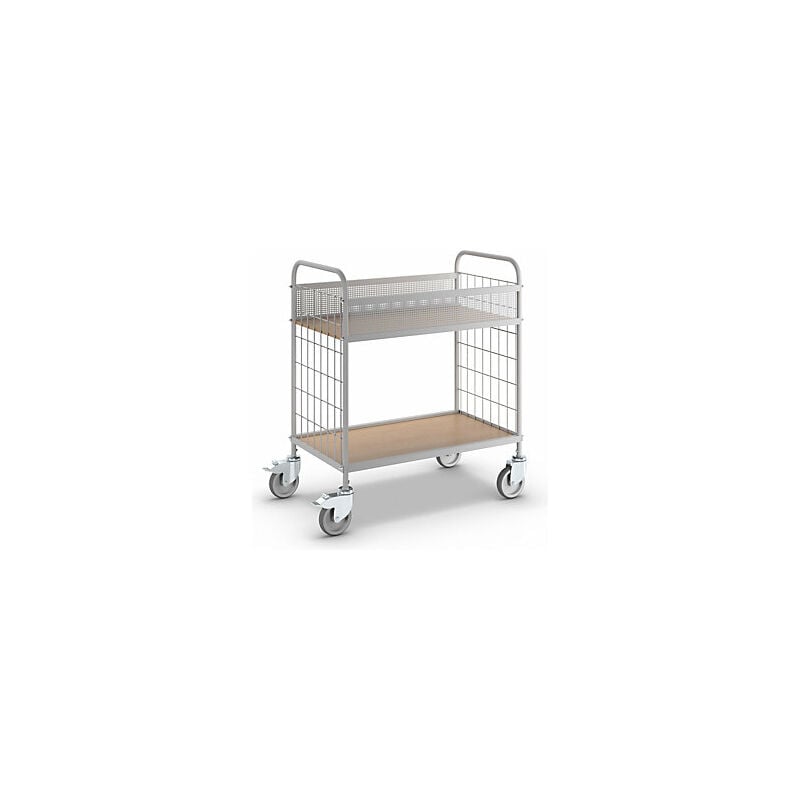 Carrello a ripiani per ufficio, portata 150 kg, con 2 ripiani, 4 rotelle pivottanti, 2 con fermo doppio, Ø ruote 100 mm. Fornitura = smontato. Portata = 150 kg. Lunghezza superficie di carico = 775 mm. Larghezza superficie di carico = 424 mm. Lunghezza = 830 mm. Larghezza = 510 mm. Altezza = 935 mm. Numero ripiani = 2 pz. Altezza ripiani = 240 / 750 mm. Portata per piano = 75 kg. Materiale telaio = tubo d'acciaio, verniciato a polvere. Colore telaio = grigio argento RAL 7001. Dotazione ruote = con 4 rotelle pivottanti, 2 con fermo doppio. Diametro ruote = 100 mm. Materiale superficie di carico = truciolato con verniciatura plastica. Colore superficie di carico = simil-faggio. Numero maniglioni = 2 pz. Numero piani = 2 pz. Tipo di prodotto = carrelli a ripiani per ufficio. Struttura in acciaio con verniciatura a polvere di qualità in grigio argento RAL 7001. Ripiani in truciolato plastificato, in simil-faggio. Portata per ripiano 50 kg. Ruote con battistrada in gomma piena antitraccia.