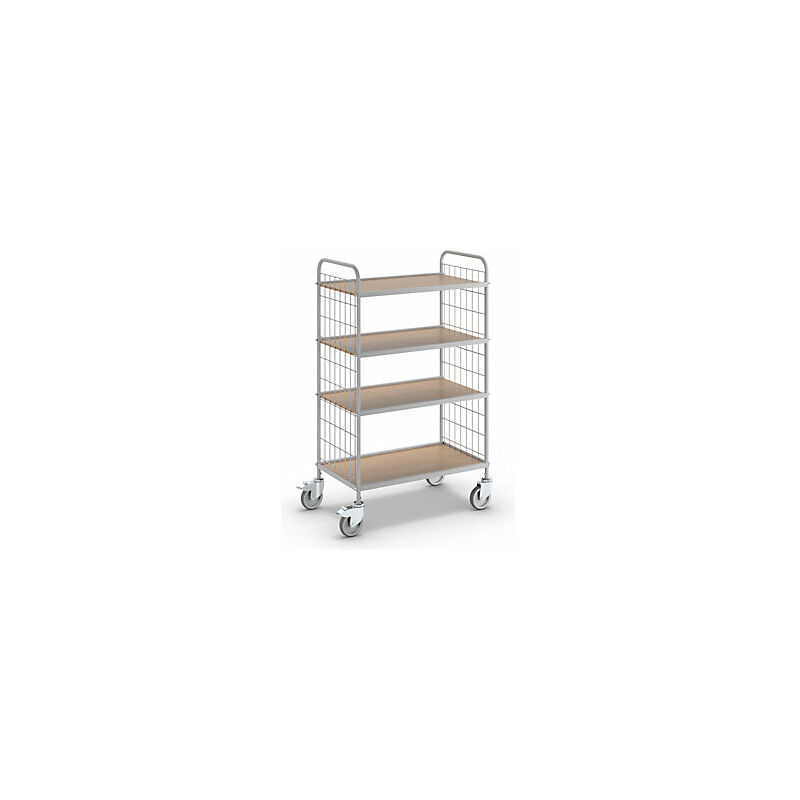 Carrello a ripiani per ufficio, altezza 1325 mm, con 4 ripiani, 4 rotelle pivottanti, 2 con fermo doppio, Ø ruote 100 mm. Fornitura = smontato. Portata = 150 kg. Lunghezza superficie di carico = 775 mm. Larghezza superficie di carico = 424 mm. Lunghezza = 830 mm. Larghezza = 510 mm. Altezza = 1325 mm. Numero ripiani = 4 pz. Altezza ripiani = 240 / 630 / 930 / 1230 mm. Portata per piano = 50 kg. Materiale telaio = tubo d'acciaio, verniciato a polvere. Colore telaio = grigio argento RAL 7001. Dotazione ruote = con 4 rotelle pivottanti, 2 con fermo doppio. Diametro ruote = 100 mm. Materiale superficie di carico = truciolato con verniciatura plastica. Colore superficie di carico = simil-faggio. Numero maniglioni = 2 pz. Numero piani = 4 pz. Tipo di prodotto = carrelli a ripiani per ufficio. Pratici. Versatili. Durevoli. Struttura in acciaio con verniciatura a polvere di qualità in grigio argento RAL 7001. Ripiani in truciolato plastificato, in simil-faggio. Portata per ripiano 50 kg. Ruote
