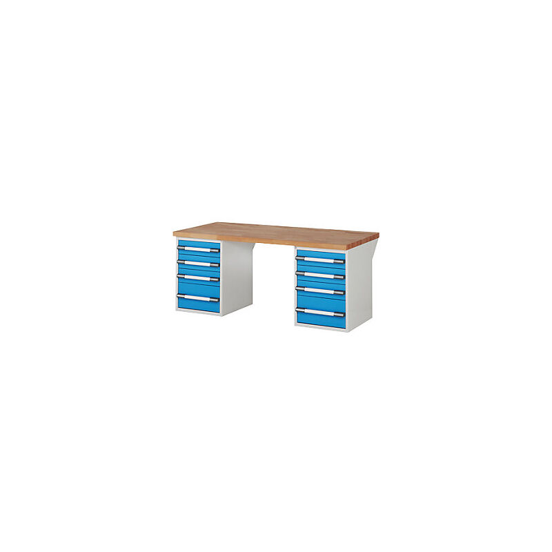 Banco di lavoro, sistema modulare Serie 7000, 8 cassetti, largh. x prof. 2000 x 900 mm. Fornitura = montato. Larghezza piano = 2000 mm. Profondità piano = 900 mm. Tipo di piano = piano in faggio massello. Spessore piano = 40 mm. Numero cassetti = 8 pz. Altezza cassetti = 6x150, 2x270 mm. Altezza = 890 mm. Colore corpo = grigio chiaro RAL 7035. Colore frontalino = blu chiaro RAL 5012. Versione cassetti = guida a rulli. Portata per cassetto = 100 kg. Estrazione cassetti = 90%. Larghezza cassetti = 490 mm. Profondità cassetti = 560 mm. Materiale telaio = acciaio, verniciato a polvere. Portata statica = 1000 kg. Colore telaio = grigio chiaro RAL 7035. Serratura = chiusura centralizzata a cilindro. Tutti i componenti sono sempre sostituibili e ampliabili. Profondità 700 o 900 mm - per una superficie di lavoro ancora maggiore. Piano di lavoro in faggio massiccio - legno proveniente da silvicoltura sostenibile e certificata PEFC. Consegnati montati e pronti all'uso! Struttura in acciaio