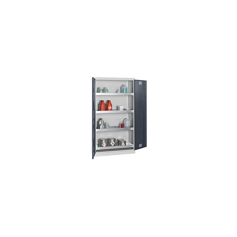 Armadio ecologico, con 4 ripiani a vasca, ante grigio antracite. Fornitura = montato. Altezza = 1950 mm. Larghezza = 1050 mm. Profondità = 450 mm. Materiale = lamiera d'acciaio. Colore corpo = grigio chiaro RAL 7035. Colore porta = grigio antracite RAL 7016. Tipo di porta = anta in lamiera piena. Superficie = verniciatura a polvere. Numero di ripiani a vasca = 4 pz. Capacità dei ripiani a vasca = 20 l. Portata del ripiano a vasca = 65 kg. Stoccaggio sicuro e a norma di legge delle sostanze inquinanti per le acque. Ripiani a vasca a tenuta stagna. Ante forate per il ricambio dell'aria. Stabile struttura in lamiera d'acciaio saldata e verniciata a polvere. Corpo in grigio chiaro RAL 7035. Ante a battente con apertura a 180°, forate per il ricambio dell'aria. Serratura a cilindro 2 chiavi incluse. Altezza x larghezza x profondità 1950 x 1050 x 450 mm. Inclusi 4 ripiani a vasca zincati, regolabili in altezza. A tenuta stagna (senza omologazione). Capacità di raccolta per ripiano 12 l.